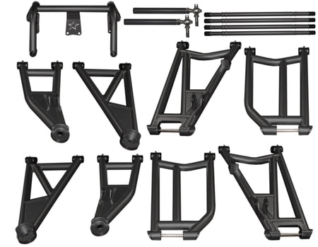 The Lone Star Racing XTR Suspension Kit for the Yamaha Rhino is 6.5" wider per side and extends the wheel base 2" forward and 2" rearward. The arms are made from 4130 chromoly for superior strength and feature quick caster adjustments on the front arms. The kit will use long travel shocks and will achieve 15.5" of wheel travel in the rear with 14.25" in the front.